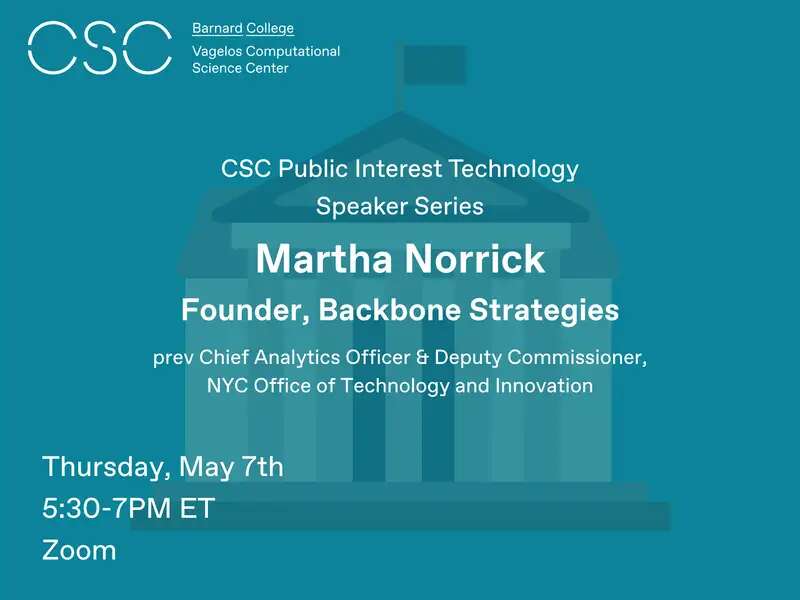 May 7 CSC Public Interest Tech Speaker Series: Martha Norrick May 7, 2026 | 5:30pm - 7:00pm Zoom (Register for Link)