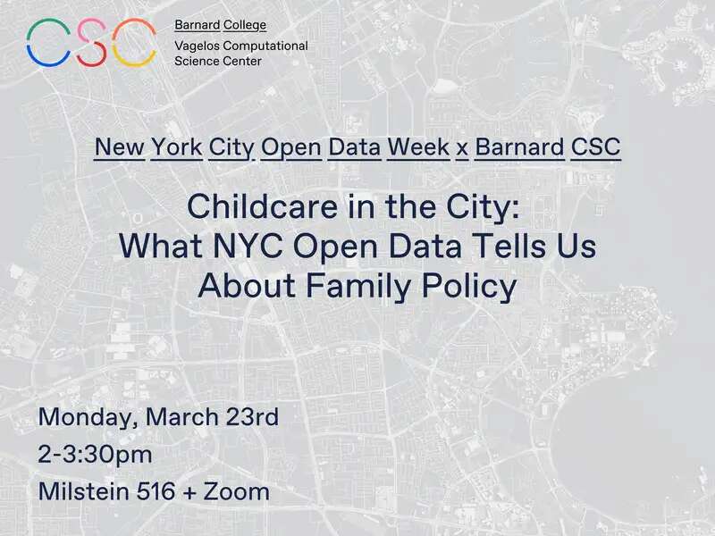Mar 23 New York City Open Data Week x Barnard CSC // Childcare in the City: What NYC Open Data Tells Us About Family Policy March 23, 2026 | 2:00pm - 3:30pm TBD (Register for Link)