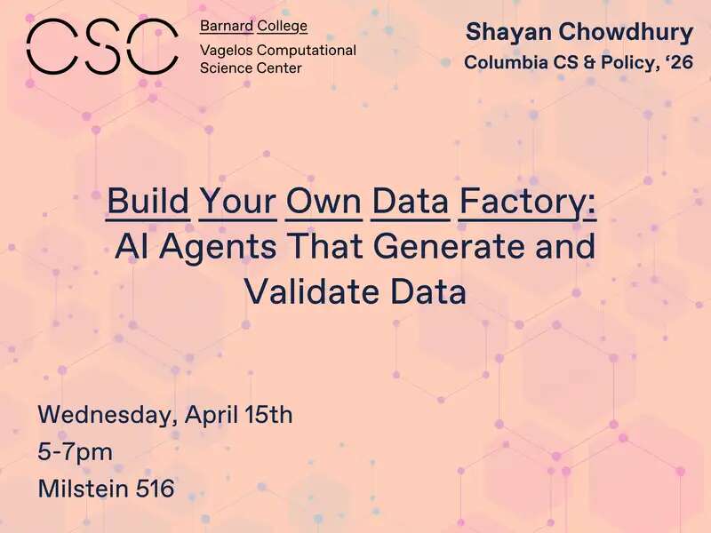 Apr 15 CSC Workshop: Build Your Own Data Factory: AI Agents That Generate and Validate Data April 15, 2026 | 5:00pm - 7:00pm Barnard College