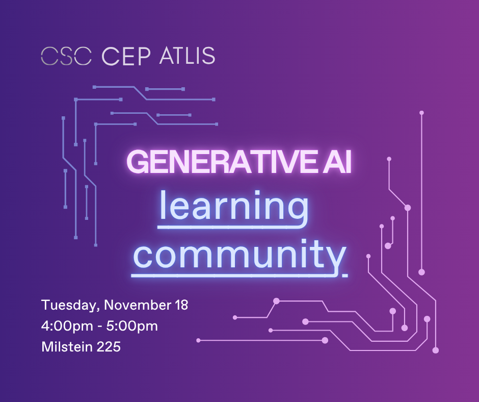 The CSC, CEP and ATLIS co-sponsor an ongoing monthly learning community about generative AI in teaching, learning and research. These meetings, open to students, faculty, and staff, are a supportive, collaborative environment where the Barnard community can play and learn about related emerging technologies.