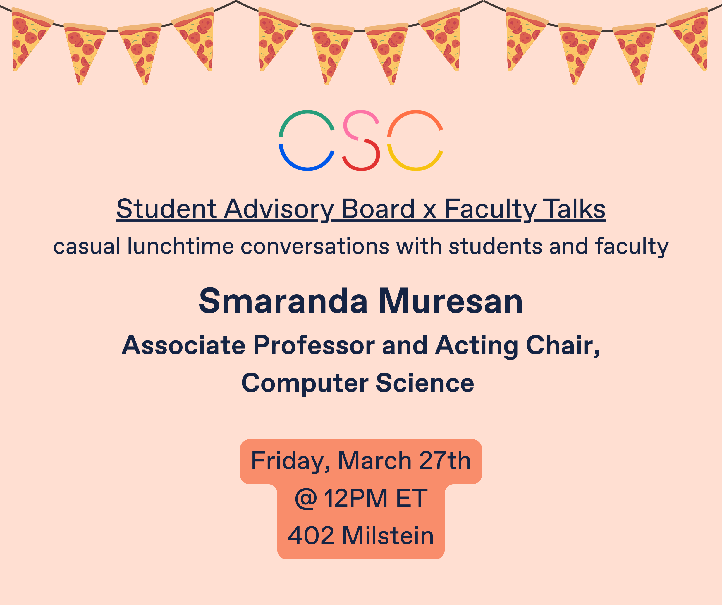 This week we’ll hear from Professor Smaranda Muresan, whose research is focused on human-centric Natural Language Processing for social good and responsible computing.
